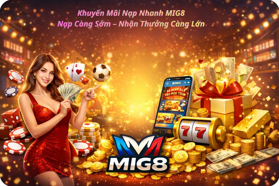 Khuyến mãi nạp nhanh MIG8 cực hấp dẫn – nạp càng sớm nhận thưởng càng lớn. Ưu đãi nạp đầu, hoàn trả hằng ngày và vô số quà tặng cho thành viên mới.