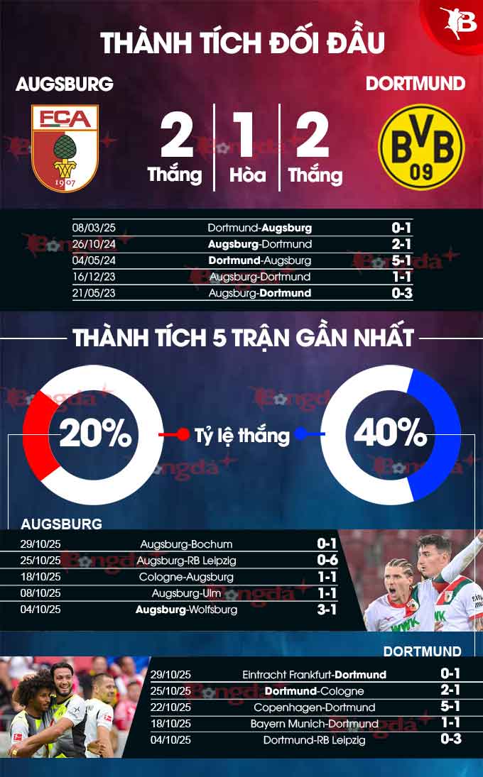 - Trong các lần đối đầu trực tiếp, Dortmund chiếm ưu thế: thắng nhiều hơn rất nhiều so với Augsburg.